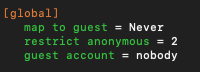 In order to prevent guest access to the samba service, the global section of smb.conf needs to be updated. Add the following lines to prevent the samba service from allowing a Guest to authenticate to the service and restart the samba service: sudo systemctl restart smbd.