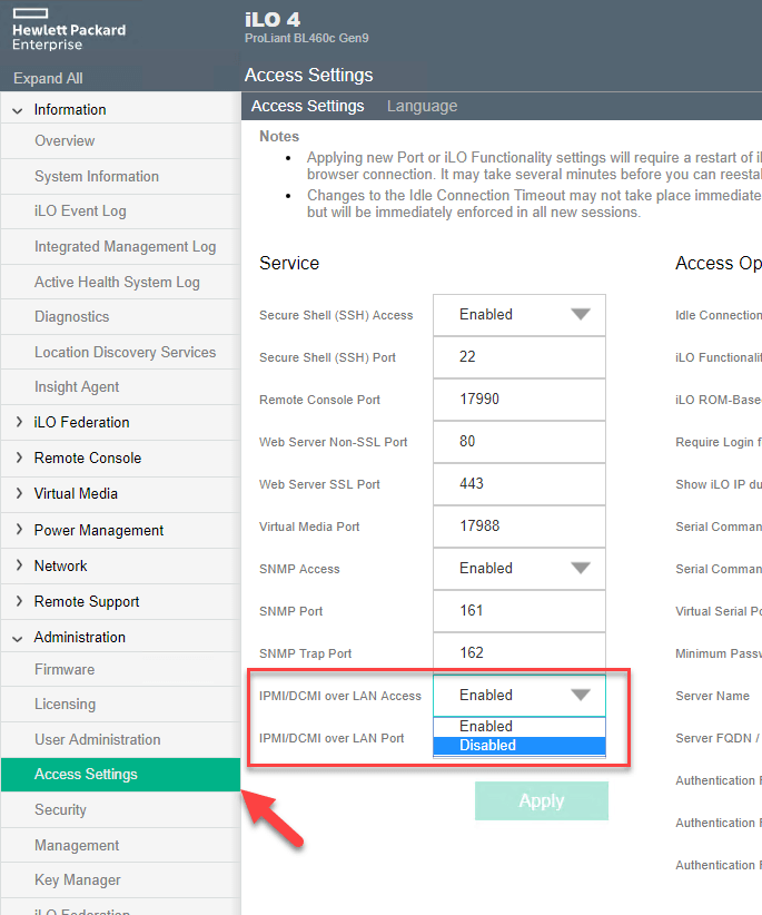 The IPMI service settings can typically be managed via the web page in the Administration section. Specifically, on the HP iLO, navigate to the Administration->Access Settings page and set the “IPMI over LAN Access” to “Disabled”.