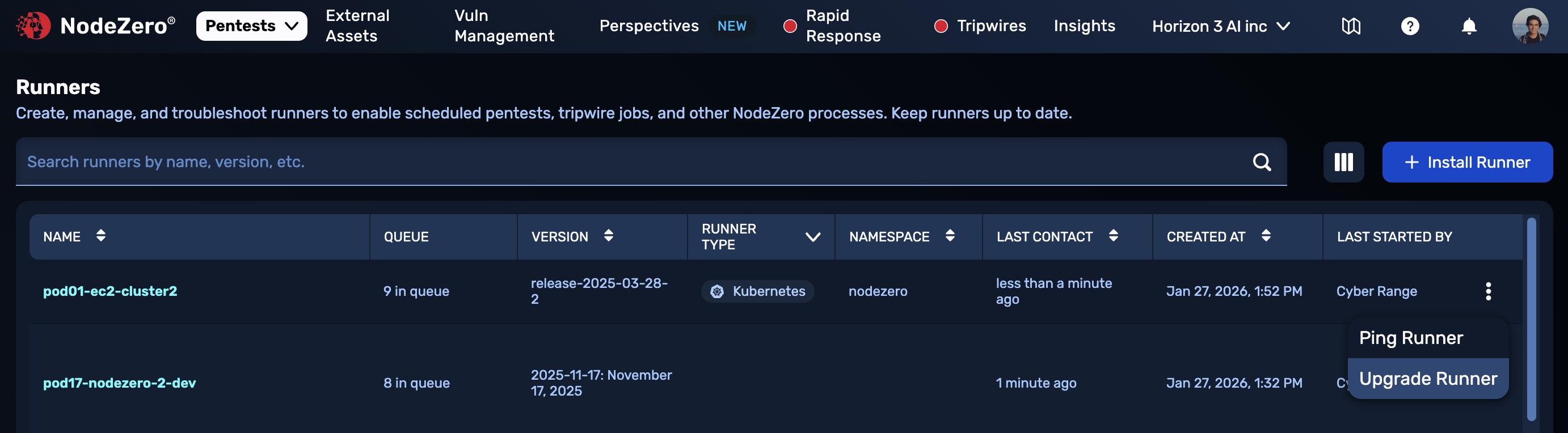 You can upgrade a Runner easily from the NodeZero Portal's UI. On the Pentests > Runners page, open the Actions () menu to the right of any Runner.