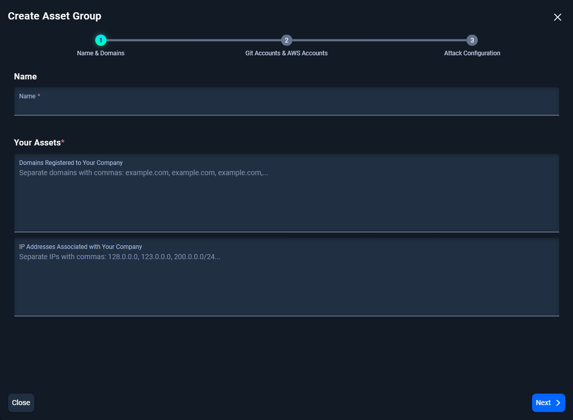 Name the Asset Group and provide company assets as domains, IP addresses, or a combination of domains and IP Addresses. A maximum of 700 domains can be added to the configuration. IP addresses need to be Public IPs only with a maximum input of 3000 entries and formatted using IP/CIDR notation. Please specify a network segment of /20 or smaller (e.g., /22, /23, /24). Both domains and IP addresses should be comma separated. Click Next.